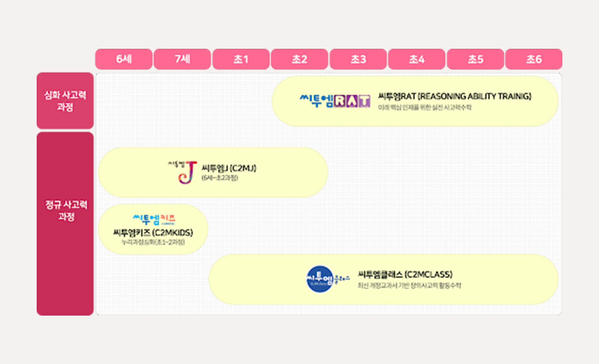 - 씨투엠 프로그램은 초등학교 저학년(6-9세)을 대상으로 기초 수학 개념을 탄탄히 다지는 데 중점을 둡니다. 수와 연산, 도형, 측정 등 초등 수학의 핵심 개념을 쉽게 이해할 수 있도록 구성되어 있습니다.